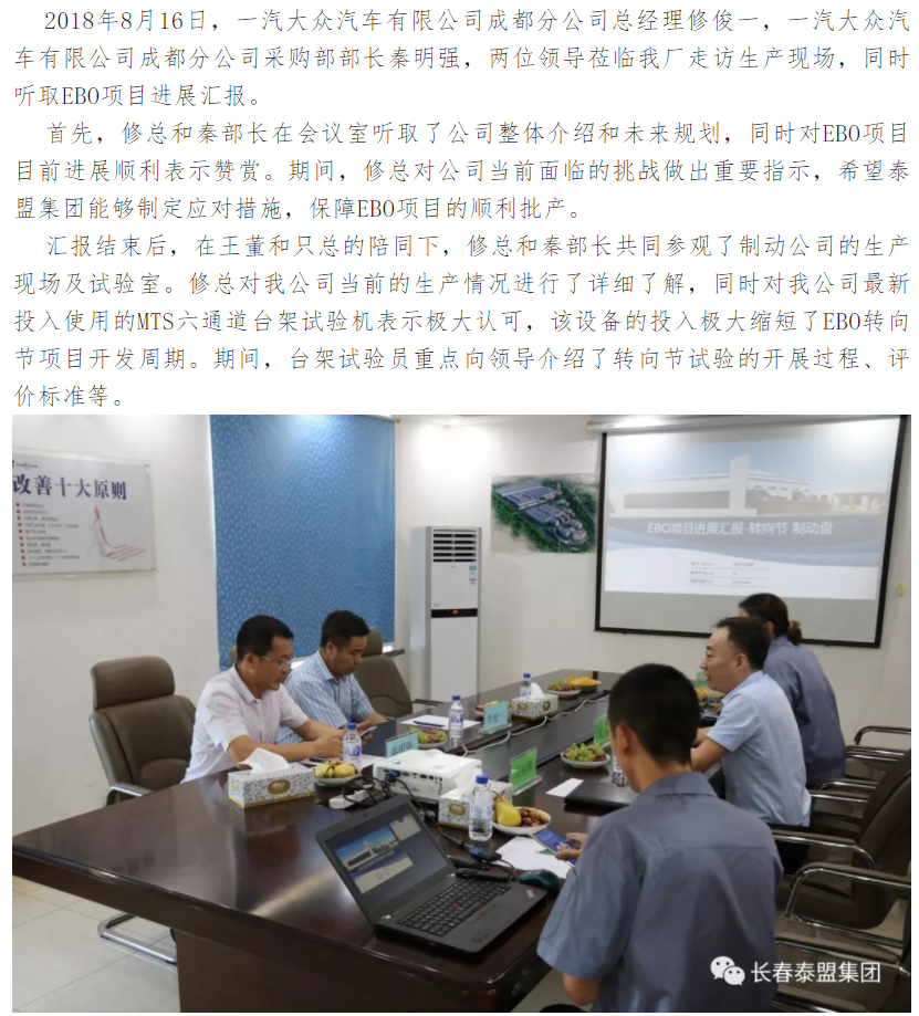 2018年8月16日,一汽大众汽车有限公司成都分公司总经理修俊一,一汽大众汽车有限公司成都分公司采购部部长秦明强,两位领导莅临我厂走访生产现场。