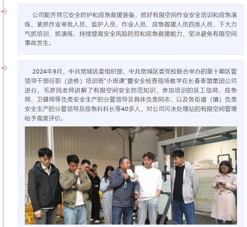 2024年9月,中共宽城区委组织部、中共宽城区委党校联合举办的第十期区管领导干部任职(进修)培训班“小班课”暨安全检查现场教学在长春泰盟集团公司进行。