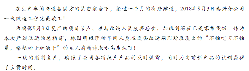 在生产车间与设备供方的紧密配合下,经过一个月的有序建设,2018年9月3日泰兴分公司一线改造工程完美竣工!一线的顺利复产,确保了公司各项批产产品的及时供货,同时为当前新产品的试制赢得了宝贵时间。