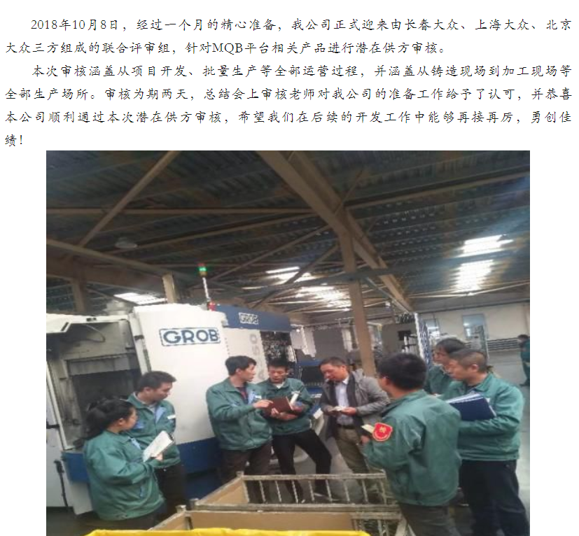 2018年10月8日,经过一个月的精心准备,我公司正式迎来由长春大众、上海大众、北京大众三方组成的联合评审组,针对MQB平台相关产品进行潜在供方审核。