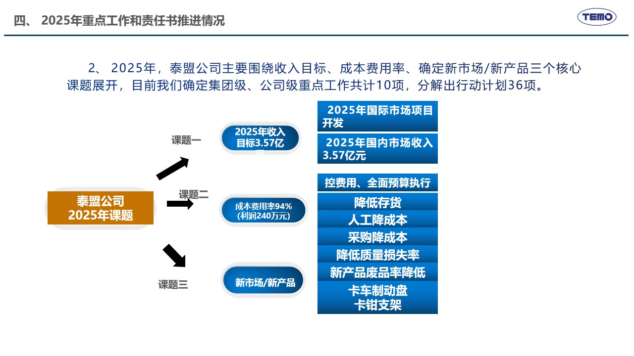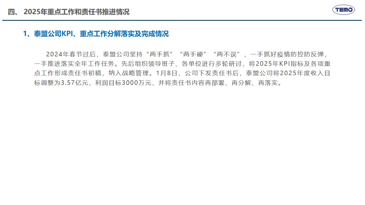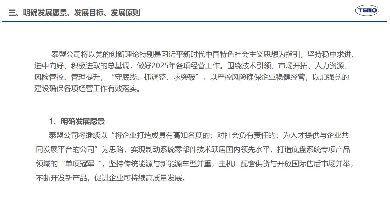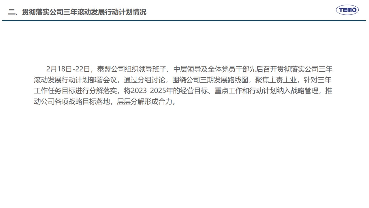2月10日,春节刚过,泰盟公司召开新年度开工动员会,主要任务是全面落实2025年度工作会议各项部署,学习贯彻董事长的讲话精神,高效推动措施有效落实。在公司年度工作会议上,董事长明确了公司“推动高质量发展,建设具有全球竞争力的创新型企业”的发展使命愿景以及未来三年的发展方向、发展目标和发展原则,提出了九大改革创新举措支撑目标的实现。