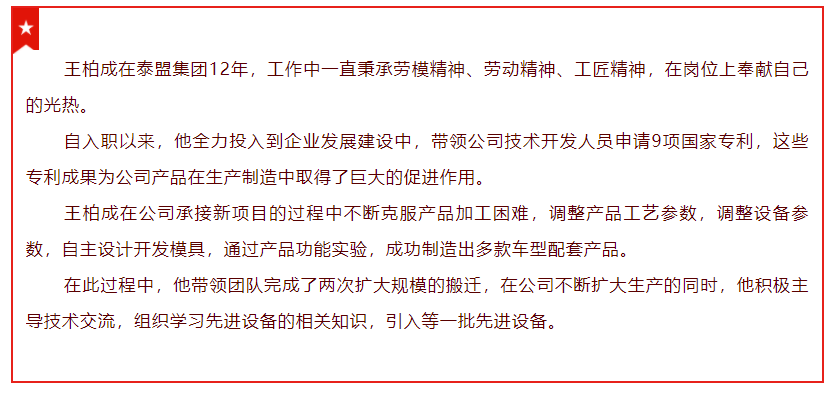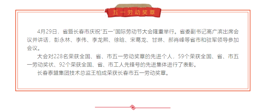 庆祝长春泰盟集团技术总监王柏成荣获长春市五一劳动奖章