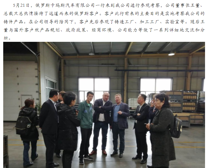 2019年5月21日,俄罗斯卡玛斯汽车有限公司一行来到我公司进行参观考察,公司董事长王董、总裁只总热情接待了远道而来的俄罗斯客户。客户此行前来的主要目的是实地考察我公司的铸件产品。在公司领导的陪同下,客户先后参观了铸造工厂、加工工厂、实验室等。